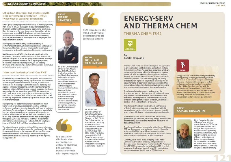 In anul 2016, Energy-Serv a fost inclusa in “STATE OF ENERGY REPORT-2016” publicatie din UAE (United Arab Emirates), pentru realizari notabile in domeniul eficientei energetice in tarile Golfului. Mai jos este prezentat un extras din raport(pag. 121)