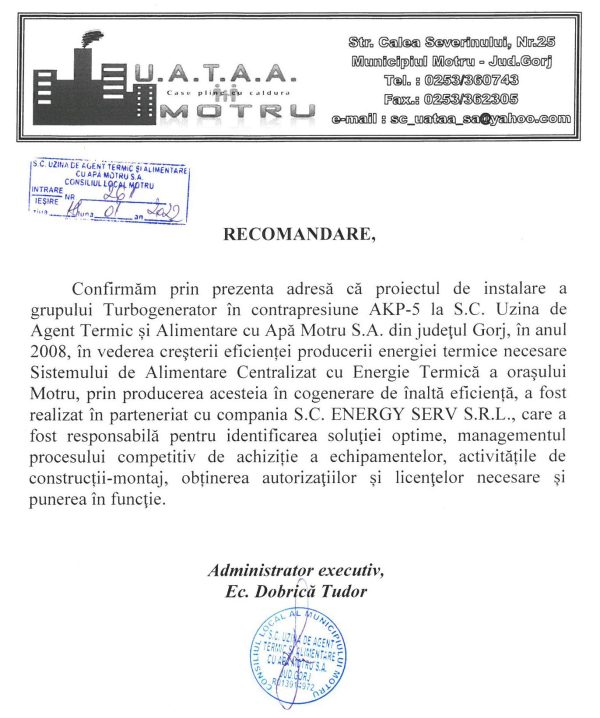 | 8 | SACET MOTRU (Studiu + Implementare) | Cresterea eficientei SACET prin instalarea unei turbine in C/P | 2008-2009 |