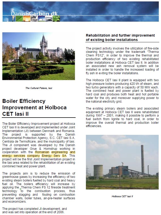 | 2 | SACET IASI (Studiu + Implementare) | Eficienta energetica CHP-carbune si vinzare credite emisii CO2 rezultate, catre guvernul Danemarcei | 2006-2012 |